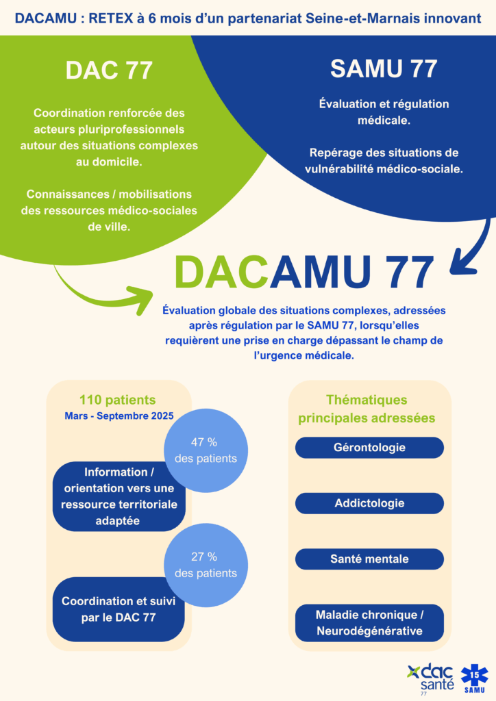 Depuis mars 2025, les Dispositifs d’Appui à la Coordination de Seine et Marne (DAC 77 Nord et Sud) et le SAMU 77 ont engagé un partenariat innovant pour améliorer la prise en charge des situations complexes, au-delà du cadre habituel de l’urgence médicale.